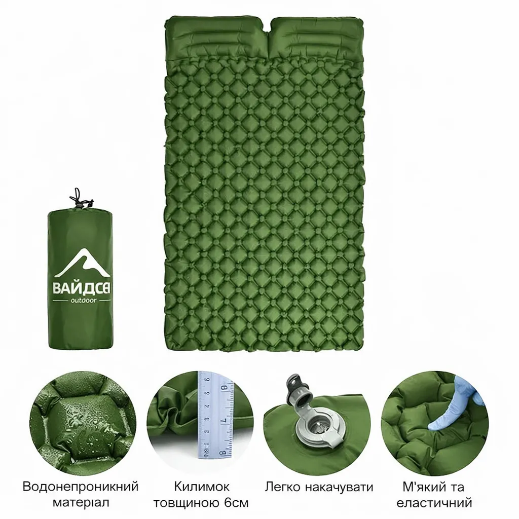 - Матрац виготовлений із водонепроникного матеріалу, тому не боїться вологи та сирої землі. Товщина 6 см забезпечує м’якість, ізоляцію від холоду та комфортний сон навіть на нерівній поверхні. Завдяки зручному клапану він легко накачується, а еластична структура рівномірно розподіляє вагу тіла.