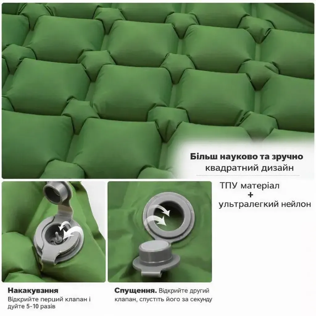 - Квадратна комірчаста конструкція матраца рівномірно розподіляє вагу тіла та забезпечує стабільну підтримку під час сну. Подвійний клапан дозволяє швидко накачати матрац без насоса та спустити повітря буквально за кілька секунд.